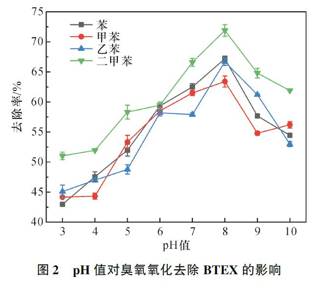 圖2為不同pH值對臭氧氧化降解BTEX效率的影響。從圖2可以看出,苯、甲苯、乙苯、二甲苯的降解效率隨pH值變化的趨勢基本相同。