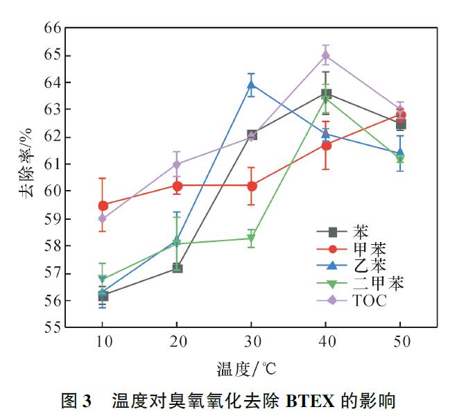 本實驗的主要目標是尋找臭氧降解BTEX的 很佳反應溫度。實驗設定5個溫度變量,分別為10℃、20℃、30℃、40℃、50℃。實驗中目標有機物的去除效率以TOC的濃度變化來評定。溫度對臭氧氧化去除BTEX的影響如圖3所示。