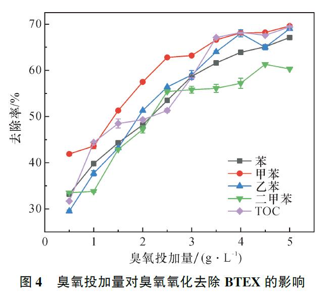 臭氧的通氣量直接影響目標有機污染物的降解效果和實際處理過程中的工藝成本。根據前人的研究成果可知,臭氧濃度越高則有機物去除率越大。但在實際處理過程中,考慮運行成本等因素,不能一味增加臭氧投加量來提高反應效率。因此,本研究主要探索臭氧投加量對BTEX去除的影響(圖4)。
